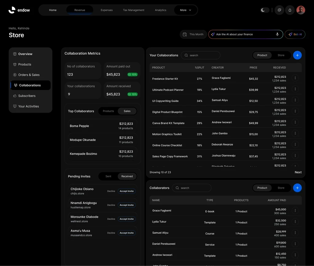 Endow is designed for creators who earn from many sources and split money with collaborators, editors, co-hosts, and partners.